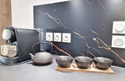 dès votre arrivée, laissez-vous charmer par l’élégance de la cuisine noire et dorée, entièrement équipée, où vous pourrez exprimer votre créativité culinaire