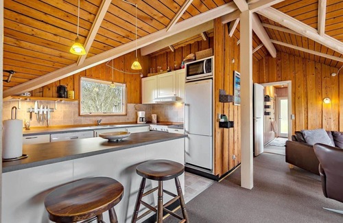experience a wonderful vacation in this beautifully equipped wooden holiday home located in kongsmark, rømø This charming house, built in 1986 and renovated in 2009, strikes a perfect balance between classic holiday comfort and modern amenities. It features a spacious open kitchen that seamlessly integrates with a cozy living area, complete with a wood-burning stove and abundant natural light from three directions.