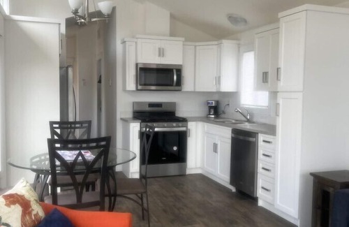this pet-friendly cottage features an open-concept living, dining, and kitchen area, offering a welcoming space to unwind The fully equipped kitchen includes a dishwasher and ice maker, with complimentary coffee and tea provided for your enjoyment.