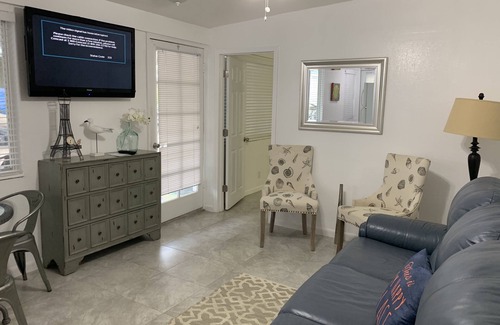 Super cute and cozy one bedroom with a queen bed, shower bathroom, kitchen, table for two large sofa and a nice outdoor covered patio seating area. Communal pool and barbecue area. Access to the canal upon request and availability..