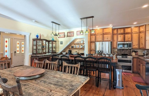 the expansive great room enjoys long views of the lake, swasey park and the rock To help bring on the fun, the dining tables accommodate from 6-16, the huge comfy camp couch can easily hold 6 charade players at a time, there is a puzzle table, inviting wood burning fireplace and hearth, large canoe wine rack, oversized reclining leather chairs, and enough rug space for stretching out. We have even hidden a hydraulic lift large screen smart TV in the custom wall cabinet.