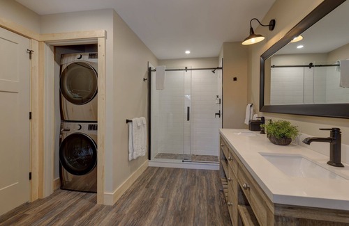 this modern rustic two-level suite comprises one bedroom, two bathrooms, and a sofa bed The interior is adorned with hickory log furniture, shiplap vaulted ceilings, and plush Adirondack-style furnishings, creating an ambiance conducive to relaxation after a day of outdoor adventures. The bathrooms offer a sanctuary of their own, featuring a pebble stone shower surrounded by subway tiles and a personal bidet toilet for added comfort.