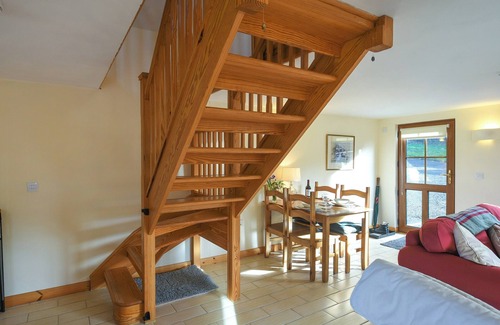 bedroom: kingsize (5ft) bed, day bed single (3ft) bed Underfloor central heating, electricity, bed linen, towels, Wi-Fi and fuel for wood burner included. Stairgate. Patio and garden furniture. 1 dog welcome, to be kept on a lead at all times (sheep country). Private parking for 2 cars. No smoking. Please note: This property has a natural water supply via a borehole, which passes though a UV unit for the drinking water. Waste is served by a septic tank. . Surrounded by the stunning countryside in the Clun Valley, this pleasant annexe is the perfect spot for a couple looking to escape the hustle and bustle. By the front door is a patio with table and chairs, to help you make the most of the surroundings. After a day of exploring the area, enjoy uninterrupted stargazing at the spectacular dark skies. The annexe feels contemporary and spacious with an open plan living and dining area on the first floor, flooded with natural light. The wood burner adds a warm touch, to snuggle up and enjoy a film on the TV in the evening. The well-equipped kitchen on the ground floor has everything you’ll need to whip up anything from quick breakfasts to hearty post-hike dinners. The kitchen has an emergency door leading into the owners garden.