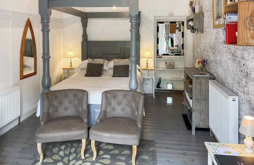 step through the inviting french doors into the spacious living/bedroom adorned with a sumptuous king-size four-poster bed, flanked by two plush tub armchairs and a smart tv, creating a cosy sanctuary for relaxation The en-suite shower room boasts a rejuvenating rain shower, complemented by luxurious amenities including a heated towel rail, soft bathrobes, and indulgent Scottish Fine Soap toiletries. Adjacent to the living area, the charming kitchenette beckons with its quaint ambience, serving as both a culinary hub and a dining retreat. Equipped with essential amenities, it offers a perfect setting for intimate meals. Draw the curtain and immerse yourself in the serene ambience, savouring delicious dishes and fine wines.