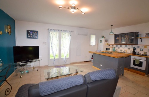spend a carefree break in this quietly located house in corsica, just a few minutes' drive from bastia airport The semi-detached holiday home offers plenty of privacy, ideal for couples or small families. Relax in the simply designed living area with practical furnishings, comfortable sofa and TV. Prepare your meals in the open-plan kitchen with a spacious work surface. Enjoy the view of the greenery through the windows or use the bright dining area for breakfast together.
