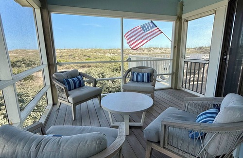 the front porch is a dream that has seating that faces the ocean for your perfect sunset cocktail or meal while hearing the ocean waves crash There is also a screened in porch in the family room that is perfect for morning coffee or relaxing.