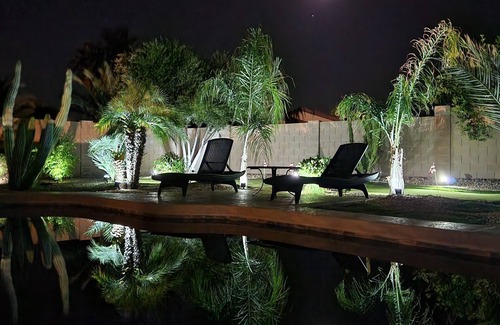 the backyard has been beautifully landscaped with 900 sq ft. synthetic grass chipping and putting, green palm trees, 5 varieties of fruit trees, cactus and other plants to give you a resort like atmosphere around the fully heated pool (GAS) heated to 80-84 degrees. Many solar lights and flood lights surround the backyard, but not so much that you cannot see the magnificent beautiful stars. You are also able to putt and chip under the illumination of this lighting. There is a propane BBQ (you may need to purchase the propane if empty) . There is ample seating in the backyard, including a four person conversational dining patio set; and recline-able loungers with umbrella.