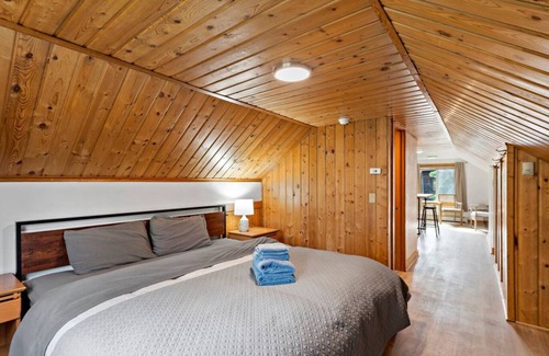 Conveniently located just minutes from the airport, our quaint attic space offers a cozy retreat in Anchorage. Featuring charming original wood paneling, this efficient unit includes a kitchen with a small range, fridge, toaster, coffee maker, and microwave. Enjoy a full bathroom and a comfortable king-size bed. On-site credit card-operated laundry adds extra convenience. Please note, access to the unit requires climbing a staircase with approximately 10 steps..