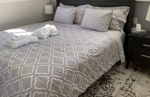 the space features a cozy living room with roku tv with cable, 3 lounge seats, a coffee table, plus a computer desk & chair in the entryway The kitchen is fully-stocked with dishes, pantry items, spices, coffee & machine, assorted teas, and any appliances you need - just let us know what items you want when booking. (Please contact us with any questions or requests.) The bedroom has its own Roku TV (also with cable) plus a king-size bed. There's also a luxurious covered gazebo / deck area with a BBQ & comfy lounge seats! The backyard is beautiful and well-maintained, and is shared with the upstairs tenants.