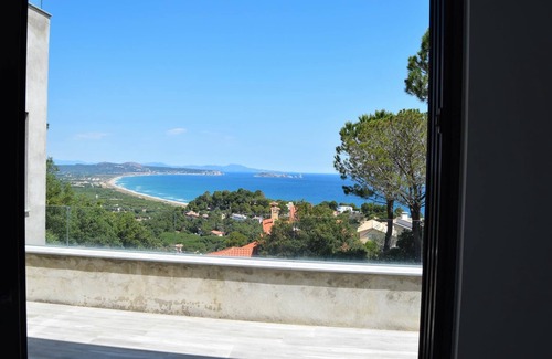 bedroom 3: large suite, double bed 180, with large bay window overlooking very large private terrace overlooking the sea and garden access + large bathroom, shower basin with bay window overlooking terrace on the sea + dressing room + private washbasin