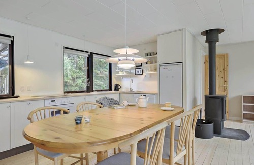 this well-appointed holiday apartment invites guests to enjoy a relaxed and cozy vacation near the water, making it an excellent choice for two families The interior features a modern and tastefully designed living space, with a spacious living room that includes a fireplace and large windows overlooking the garden. The open kitchen, equipped with a dishwasher, electric/gas stove, oven, fridge, coffee maker, and kettle, allows for enjoyable meal preparation together. The layout comprises four bedrooms: one with a double bed, two with bunk beds, and one with two single beds, complemented by a contemporary bathroom with a shower. Additional amenities include underfloor heating, internet with Wi-Fi, and a washing machine. Outside, a large wooden terrace with an electric awning offers perfect spots for sunbathing and family gatherings. The property is located in the beautiful Geopark Odsherred, close to shops, cafes, and pristine beaches.