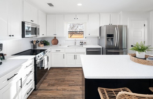 sandy shores retreat boasts a fully stocked kitchen with quartz countertops and stainless steel appliances, three primary bedrooms (two king beds and one queen bed, each with tv and closet), and a bunk room with two twin-over-twin built-in bunks