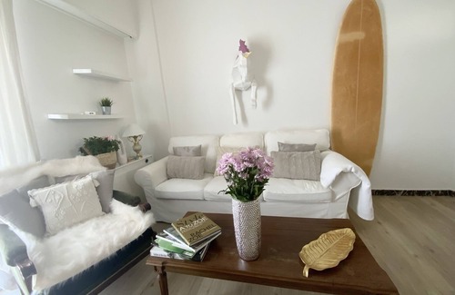 This is a very special big modern Maison d’ artiste with beautiful bright white surroundings and curated layers for pleasant, cozy staying, vacaytioning and work from home. A very fresh and big open design working/ gathering space with a cushy, relaxing living space with a sculptured fireplace and lounge patio! This is a detached building with an independent access, a ground floor reception and an upstairs space of 150 sqM. The house is 10 minutes driving away to Athens Riviera and to the Athens City Center, placed ideally in the middle. The space is a beautiful artistic and vast live/work space! A very fresh and modern large working space and a cozy, let back and relax living area. It used to be my family’s art studio, and has a creative luminous atmosphere all around! It’s freshly renovated and restored, fully equipped, inverter A+++ air-conditioning in every room, 55” smart tv, full equipped kitchen, one bathroom with bathtub, one toilet, balconies all around the house as it is on a corner and a lounge balcony area at the master bedroom. It’s bright, sunlit, spacious with high ceilings, filled with lovely little touches, perfect for couples, friends or a family!.