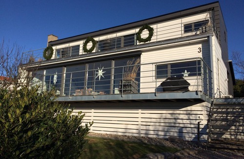 Welcome to our beautiful house right by the Kattegatt sea, close to the city of Varberg. Here you live in a house of 150m2 on two levels with wonderful sea views from almost all rooms, only 90 meters from the water. We have two large terasses, one on each floor, which are very well suited for comfortable relaxing in the lounge furniture , as well as dinners out in the sun. The house has an open floor plan with a large living room and kitchen in one. There are 4 bedrooms, one with 180cm double bed and bathroom connected, two with a queen size single bed, and one with a bunk bed 120 + 90cm.