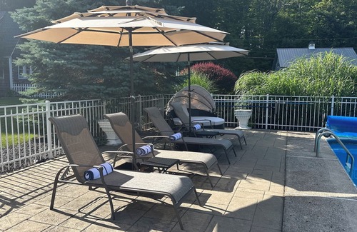 Beautiful private & secluded 17 acres mountain top retreat. 4 acres of wooded area and 13 acres of grass fields for use to play football, soccer, baseball and many walking paths. Breathtaking views, private in ground heated pool (Pool Is only open memorial day - mid September) with white sand beach area with fire pit. You'll be sure to enjoy views. Also for your enjoyment there is a swing set , horseshoe pit and an additional outdoor fire pit for roasting marshmallows by the camp fire. Grounds are fully illuminated for night time use. In the fall you have panoramic views of the foliage, nature hiking out the back door and a great time of year for the outdoor fire pit. This property is also a great winter retreat with sleigh riding right in the back yard and a beautiful wood burning fireplace to sit by. This is truly a 4 season home to enjoy. This home is located only 5 min to Lake Wallenpaupack, Claws and Paws Zoo and 25 min. to Mt.Airy Casino, The Crossings Outlet shopping, Camel back skiing & Beach & the new Tree top adventures and Zip lines ;.