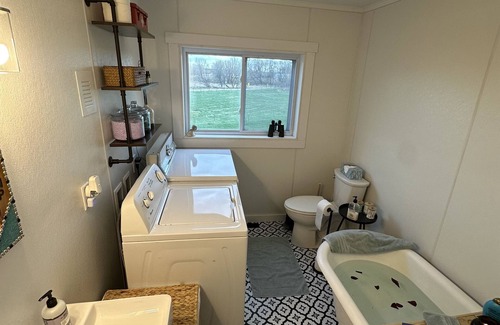 the original clawfoot bathtub ensures a relaxing hot bath (there is no shower) We have the water heater turned up to make sure you can have a nice long hot bath. Be careful the hot water is HOT, in the kitchen and bathroom. Basic toiletries and bath salts are provided.