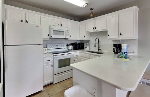 Welcome to Grand Caribbean #306 East, a one-bedroom, one-bathroom gulf-side condo in Perdido Key, Florida. Nestled on the third floor, this cozy condo offers the ideal blend of comfort and convenience for your beach getaway. Step inside the inviting living space featuring a queen-sized sleeper sofa, flat-screen TV and glass French doors leading out to your private balcony. Here, you can enjoy serene mornings with a partial view of the Gulf of Mexico, sipping coffee as the sun rises. The kitchen is fully equipped with all the essentials so that you can make delicious homemade meals with your loved ones. Enjoy your meals in the dining area and stay for late-night conversations or a card game. You will love the comfort of the king-sized bed in the primary bedroom, and kids or extra guests will appreciate the bunk nook in the hallway.