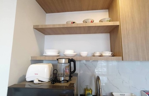 full kitchen facilities to cook with dinning table and working table are in one set and medium size refrigerator You can leave door open for windy if you prefer natural air, as we have door stop for you. This is very safe compound with CCTVs in the public area. DIGITAL SAFETY BOX is provided and everything you needed.