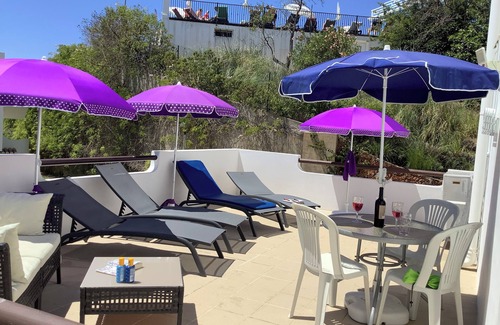 the apartment is unique in benefiting from an extra large wrap around terrace bathed in full sun until late in the day The elevated position of the apartment gives views over the resorts well maintained and landscaped gardens. There are four sun beds on the terrace, a dining table and chairs, sun umbrella's and a relaxing sofa with coffee table.