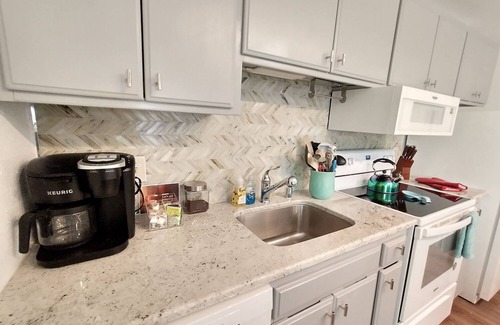 the kitchen also features a large granite island, perfect for preparing and serving meals We offer island power for those who need a laptop/work touchdown area.