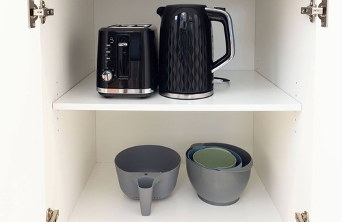 - kitchen:equipped with basic utensils and pots, kettle, toaster, vacuum, mop, broom, and a dustpan