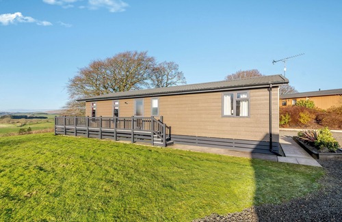 Contemporary and spacious lodge set in an elevated position with one master king-size bed with en suite shower, flatscreen TV and DVD. One twin (can be linked to form double on request) with flatscreen TV and DVD, connected to main bathroom with roll top bath and separate shower. Stylish and spacious open plan modern lounge/kitchen and dining area. American style fridge/freezer, range cooker, wine cooler, coffee machine with starter pack and washer/dryer. Living room features a 50" TV, Bluetooth surround sound, wrap around sofa and recliner chair. Fully glazed patio doors leading to spacious decking with spectacular hilltop views down the valley. Outdoor hot tub. Sauna. Bathrobes and slippers provided. No pets.