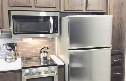 step into the full-sized kitchen, equipped with a 3-burner cooktop, oven, full-sized refrigerator, microwave, and all the essentials for meal preparation, including plates, glasses, pots, pans, utensils, and flatware