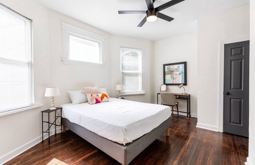 after a day out and about exploring the city, enjoy your down time streaming a movie or your favorite show in the living rooms featuring smart tvs and comfortable sofa and seating options Rich, dark hardwood flooring runs throughout the home in the lower-level unit, accented by calming neutral tones and bold pops of color. In the upper unit, the spacious living and dining areas can accommodate a crowd when you wish to gather the whole group together. Fully equipped kitchens in each home feature stainless steel appliances, coffee makers, and a full suite of cookware and dining ware for the convenience of making meals at home. The upstairs dining table offers seating for 6 to share food, play games, or spend quality time together, or you can take casual bites in the lower unit at the kitchen counter with barstool seating for 2. For some fresh air any time of day, grab your coffee or an evening cocktail and pop out onto the front porch, featuring additional outdoor seating for 2.