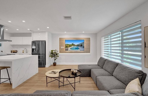 2 homes side by side. Ideal for a group of 16, immaculately clean, remodeled & modern, featuring 6 bedrooms, 4 baths + office. Just 15 minutes from Las Olas, the beach, FLL airport, Hard Rock Casino, and Stadium, this prime location offers convenience. Enjoy a heated saltwater pool, 2 fire pits, hammocks, artificial turf, 3 BBQ grills, night lighting, axe throwing, cornhole, connect 4, pool floats, and more. Luxury towels and linen for your comfort. quick access to major highways (4 min)