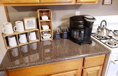 two other bedrooms with their own full bath, and an extra twin bed in the common area Fully equipped kitchen for complete meal preparation and dining room for six. Smart TV boasts all of your popular streaming networks, just bring your own passwords. High speed wifi and full coffee bar are complimentary. Front and rear deck have seating and overlook the spacious yard. A bbq grill and grilling utensils are also provided. No pets, no smoking (home is pet dander free).
