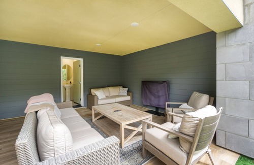 the middle level includes two bedrooms and a laundry room with a washer/dryer One of the bedrooms has a smart TV, while the bunk bedroom has a walk-in closet and an en suite bathroom. From the lower level, you can access the home's private enclosed patio, where you will find a comfortable lounge area, a putt-putt green, two loungers, and a Ping-Pong table. this area is perfect for relaxation and entertainment!