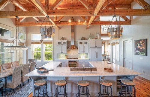 the main floor opens into the living space with heart pine floors, vaulted ceiling and open beam structure The gourmet kitchen boasts marble counter tops, stainless farmhouse sink and appliances, 5-burner gas range, wine cooler and separate ice maker. The comfortably furnished living room offers a gas fireplace, large flat screen TV with DVD player and telescope for ultimate star gazing.