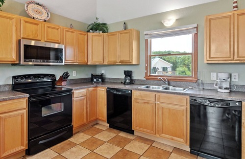 on the ground level, enjoy a swim in the large private pool* and relax in the warm, bubbly hot tub after a day of frolicking in the surf and sand Pass by the Outdoor Showers that are perfect for rinsing up after enjoying a day in the sand at the Bias Lane Beach Access which is only a 5-minute walk away. Play some Volleyball in the backyard and enjoy the large, grassy yard that's perfect for the kiddos to enjoy as this quiet neighborhood makes it easy to relax in what feels like your own private resort. cook up something delicious on the charcoal grill and be sure to bring plenty of treats for the family pooch, since your dog is welcome to vacation with you at a spotted duck!