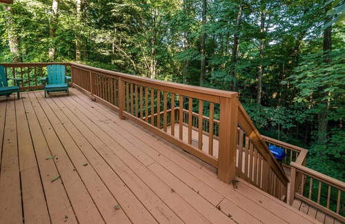 step out the back door on to the multi-leveled deck overlooking the brown county hills The deck is equipped with a large patio table with umbrella, chairs, BBQ grill, and a large 6 person covered hot tub. It's a wonderful place for relaxing after a full day of exploring Brown County Indiana.