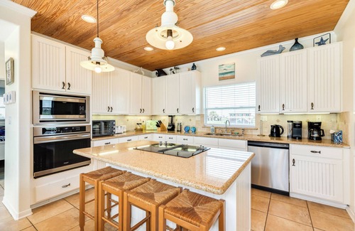 inside, the main level’s open-concept design is bright and welcoming, with a wall of windows that showcase incredible gulf views The living area features a large TV, DVD player, and seating area, making it a great spot to unwind after a sun-soaked day. A spacious kitchen with a large island, breakfast bar seating for four, and ample counter and cabinet space flows seamlessly into the dining area, where two tables (one seating six, the other four) invite everyone to gather for meals with a water view. This level also includes three well-appointed bedrooms: a king suite with a TV, en suite bath, double vanity, and walk-in shower; a second king bedroom with a TV; and a bunk room with a pyramid bunk, twin bunk, and TV. A full bath and a washer/dryer add extra convenience. Step out onto the partially covered deck to take in the salty breeze and second row Gulf views.