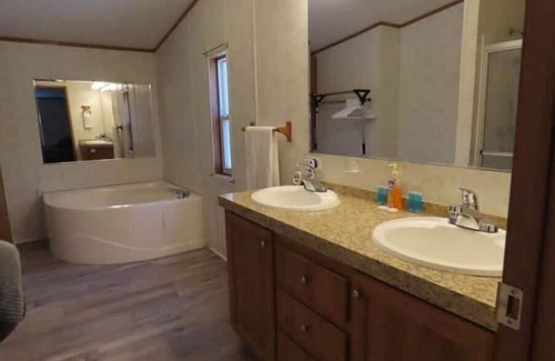 this house is on approximately 3 acres and includes a boat house There is a tree swing in the front yard. The front porch has a few stairs and a wheelchair ramp. The house is about 1500 square feet and includes a master bedroom with one king bed and one bathroom with shower and garden tub. It includes a 32" TV with an antennae. Second bedroom includes queen bed and twin bunk beds. Third bedroom also includes queen bed and twin bunk beds. There is a shared bathroom with a tub and shower. The living room has a 58" Roku TV and DVD Player. The internet service is StarLink. Dining room has a sliding patio door that opens to the back yard.