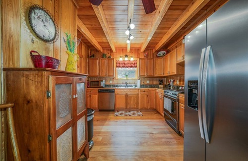 Welcome to Sara's Retreat, a private and lovingly hand-built custom cabin, being offered to you by Sara's children and White Squirrel Realty & Rentals. Sara's Retreat has features your entire group will love and is close to Dupont State Forest and Downtown Brevard. This rustic yet modernly comfortable home has a long gravel circular driveway with dedicated guest parking spaces for multiple cars. A parking space is reserved for guests with electric vehicles by the J1772 Electric Vehicle charger provided by the homeowner. The kitchen door serves as the main entrance to this family friendly home and is easily accessed by 3 steps. Upon entering our home, guests are greeted by the open great room with high ceilings, huge hand-hewn beams, and tongue-and-groove ceilings. The living room is complete with a wood-burning fireplace, plenty of comfortable seating, a SmartTV, rustic touches chosen by Sara herself after her huband made her dreams of a mountain cabin come true. The dining area is off the living room and has a table with spaces for 6. The thoughtfully equipped kitchen comes with a standard coffee pot, a Keurig, and all the dishes, pots, and pans guests will need to create meals for their group. A half-bath/powder room is located just off the kitchen.