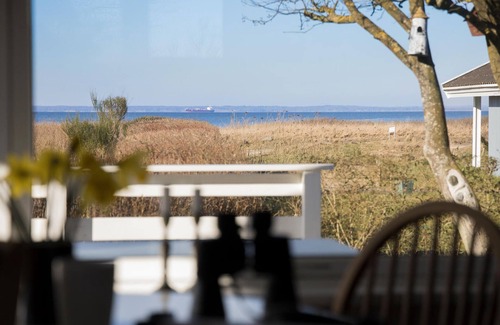 outside, a spacious, covered terrace awaits you with comfortable seating and a barbecue for cosy evenings Breathe in the fresh sea air, enjoy the sun or cosy up with a blanket and a hot drink while you take in the tranquil surroundings.