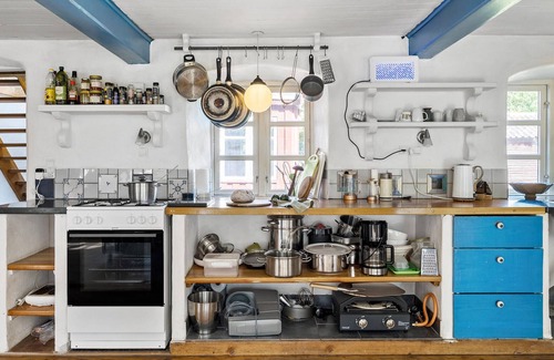a warm and inviting atmosphere awaits you in this charming country holiday home The beautiful wooden ceilings, exposed half-timbering, floorboards and brick fireplace give the spacious rooms on two floors a rustic character that will make you and your family feel right at home. Start your holiday in the morning with a breakfast together, which you can prepare in the open-plan kitchen with wood-burning stove. At the dining table, you can not only enjoy your meal, but also the view through the mullioned windows while you discuss your activities.