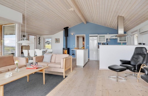 the center of the house is the open and bright living area with open kitchen and dining area, where good family life can take place on vacation Relax here on the sofa with a good movie or cook the family and friends a delicious meal from the well-equipped kitchen. After a long walk, a fire in the fireplace spreads warmth and coziness. You also have three bedrooms with two double beds and one bunk bed at your disposal.