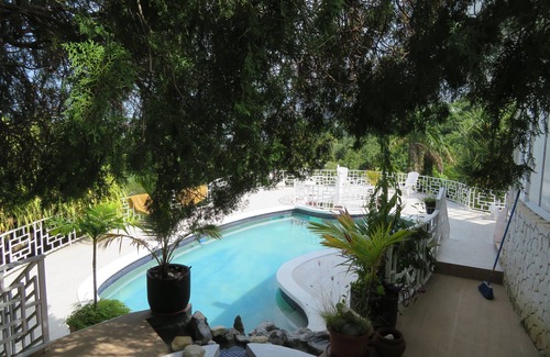 Stunning View of the Bay, Sea, Mountain, City. Elevated pool with view to die for. Lush Gardens, Outdoor decks, Outdoor Jerk/Cooking area. Large spacious outdoors. Located atop plateau. Wild birds..