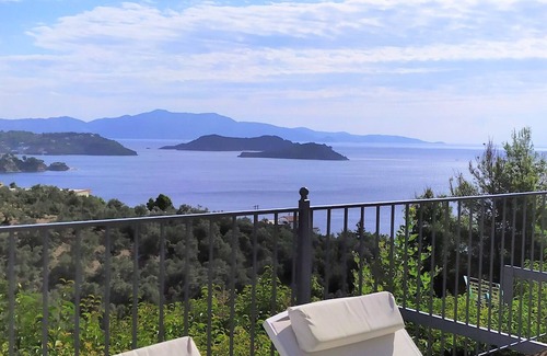 the villa consists of three bedrooms with double queen's beds each, plus two very modern and fully equipped bathroomsOn the 45 sqm wooden deck the pool plus a kiosk and dining facilities, are nested.Up to seven people can sleep.The whole place has stunning sea views. A charming environment awaits and promises you unforgettable moments of calmness and relaxation, as despite it stands alone on the top of Katsarou hill, at the same time is very close to Skiathos town.