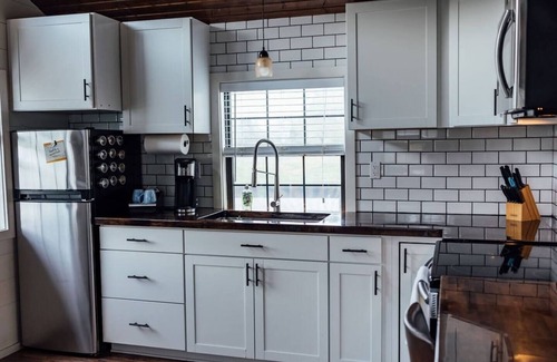 3 Modern micro cabins (560 sq. ft. each) sit on the back 5 acres of a private estate. You will have the entire 5 acres to yourself, including a newly constructed 1.5-acre pond with a swimming beach. each of the cabins includes the following amenities: