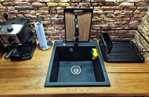 prepare your favorite meals in a fully hand-made wooden kitchen, equipped with everything you need—from free coffee and tea to a water filter for a healthy vacation Enjoy your meals at the kitchen bar with high chairs, the dedicated dining area, or the charmingly lit balcony.