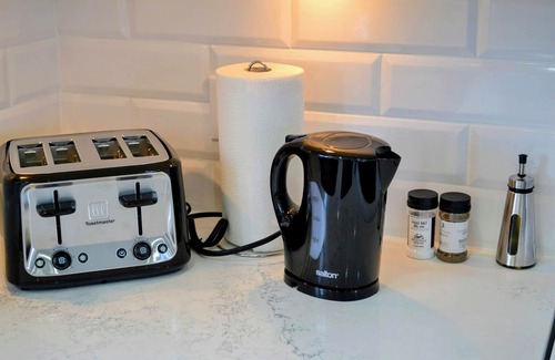 fully equipped and updated kitchen with everything you need to enjoy your meals, whether cooked in-house or take out Appliances include: Fridge/Freezer, Microwave, Stove/Oven, Air Fryer, Kettle, toaster, and a dishwasher. Kitchen cabinets also include cooking utensils and supplies such as pans, plates, mugs, glasses, cutlery and more. The complimentary coffee & tea station is an added bonus for those who need their morning fix.