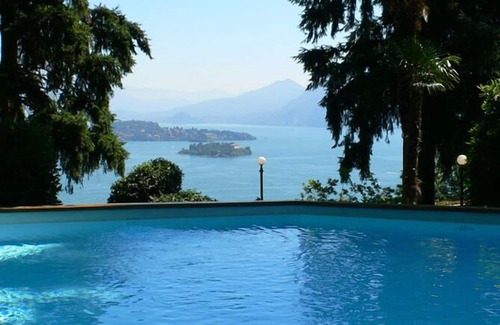 The Art Nouveau Villa "Villa Anna Isole Borromee" from 1908 is located about 1.9 km above Baveno and the beautiful lakeside promenade and the ship berth. Many excursion destinations can be reached with the passenger ferry. The train station of Baveno is just 2 km away. By train, B. the heart of Milan in about an hour. It is also a privileged and quiet panoramic position with a breathtaking view of the lake, the Borromean Islands and the surrounding mountains. During the careful restoration of the listed Art Nouveau villa, the structure of the old façade was preserved or restored. The result: a stylish villa with modern comfort, but the charm of the original facade with beautiful paintings. In the year 2017 the attractive 1-, 2-, 3- and 4-room apartments were last renovated and new, the style of the villa according to taste furnished. All pantry kitchens have dishwasher, 2-plate induction cooker and microwave. In addition, most apartments of the main house are characterized by a wonderful private outdoor area with terrace and garden or Balcony with gigantic lake, island and alpine views. On the same site is next to the Jugendstilvilla an 8-family house (apartments No. 21 to No. 24). All apartments are tastefully furnished and the well-equipped kitchenettes have a dishwasher, microwave, etc. In addition, most apartments are characterized by a beautiful private outdoor area with garden or Balcony and lake, island and alpine views. All apartments also have free Wi-Fi internet access and a communal outdoor area consisting of a sun terrace ("solarium") and a garden of approx. 1 000 m². Here is also the beautiful pool (about 10 m x 7 m, weather permitting opened from approx. Mid May to approx. End of September) with garden shower, sunbeds and umbrellas. Children also enjoy the small children's playground. A washing machine is available for a fee for general use. The apartments in the main house can be reached either via the stairwell or also comfortably by the elevator. You can park your car within the property on two different parking spaces. 3-room corner apartment No. 13 in the 2nd floor. Living-dining room with pull-out couch for 2 persons, SAT-TV, dream-view and exit to the balcony kitchenette with dishwasher, 2-burner stove and microwave bedroom with double bed (through-mattress) second Bedroom with 2 single beds Friendly bathroom with shower, bidet and window Balcony with seating for 2 persons and breathtaking view of the lake, the Borromean Islands and the surrounding mountains Approx. 1. 000 m² large communal garden with 10 m x 7 m large pool, sun terrace, large Liegewiese as well as panorama view of the lake, the Borromean islands and the surrounding mountains.
