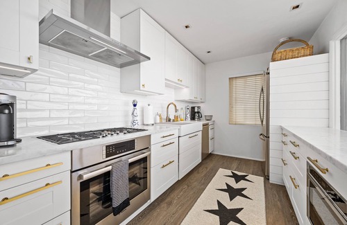 the primary suite, located on the second level, with plush king bed is the perfect private retreat, complete with reading nook fully stocked with a library of titles to enjoy The large en-suite bathroom with double vanity includes a frameless glass enclosed tub-shower. The secondary bedrooms include the following sleeping arrangements: queen bed with en-suite bathroom on the ground level, two twin beds with access to hallway bathroom on the ground level, and queen bed with access to hallway bathroom on the second level. Each bedroom and bathroom are fully stocked with hotel quality bed linens, pillows, and towels for ultimate comfort.