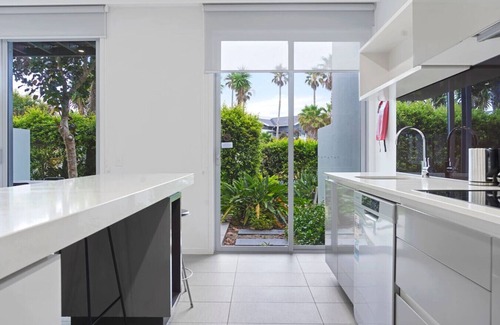 the sleek, modern kitchen is fully equipped with top-tier appliances, ample counter space, and all the cookware you need to prepare your favourite meals