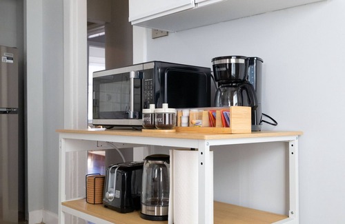 - fully equipped kitchen with pots/pans, toaster, microwave, oven, coffee machine, coffee, kitchen knives, bakeware, dinnerware, coffee mugs, wine glasses, cooking utensils, kettle, tea, basic condiments, and more!
