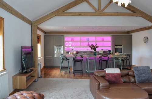 thoughtfully designed on the inside and out, carr end barn b offers all the comforts one expects from a holiday home including a well-equipped kitchen, contemporary bathrooms, comfortable bedrooms, freeview tv, x-box one and a wood burner to warm those long winter evenings The exterior is equally impressive. The decked patio enjoys lovely views over open countryside and is perfect for hosting a barbecue (provided), whilst the children play games on the large lawned garden. There is a fantastic outdoor hot tub which can be enjoyed all year round and should the weather take a turn for the worst, you can retreat to ‘The Cave’. Built by the owner as an indulgent folly, this stone built cave is heated, weatherproof and has comfy seating, TV and an open fire.